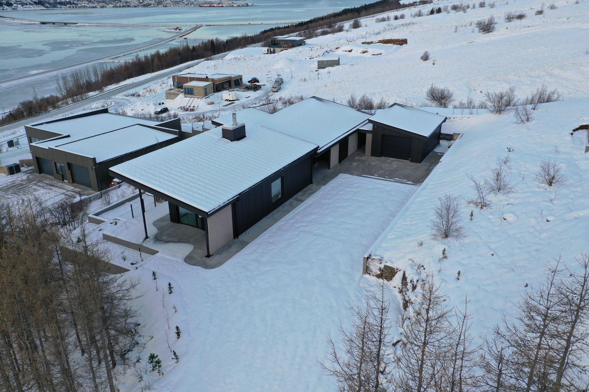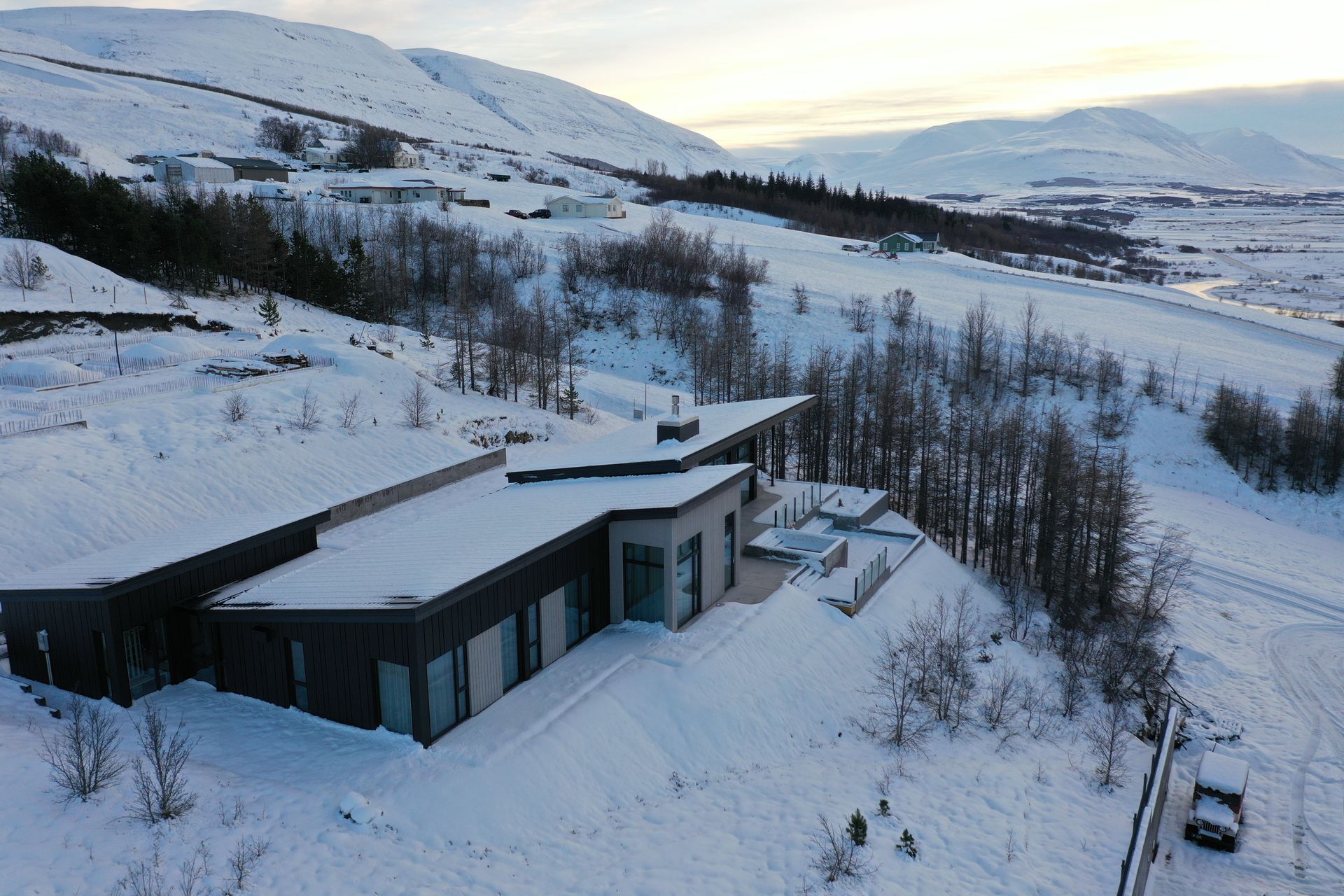 Útiaðstaða er hluti af heildarhugmynd hússins, þar sem pottur og notarleg svæði eru mótuð til að njóta útsýnisins og styrkja tengsl milli innanrýmis og umhverfis.