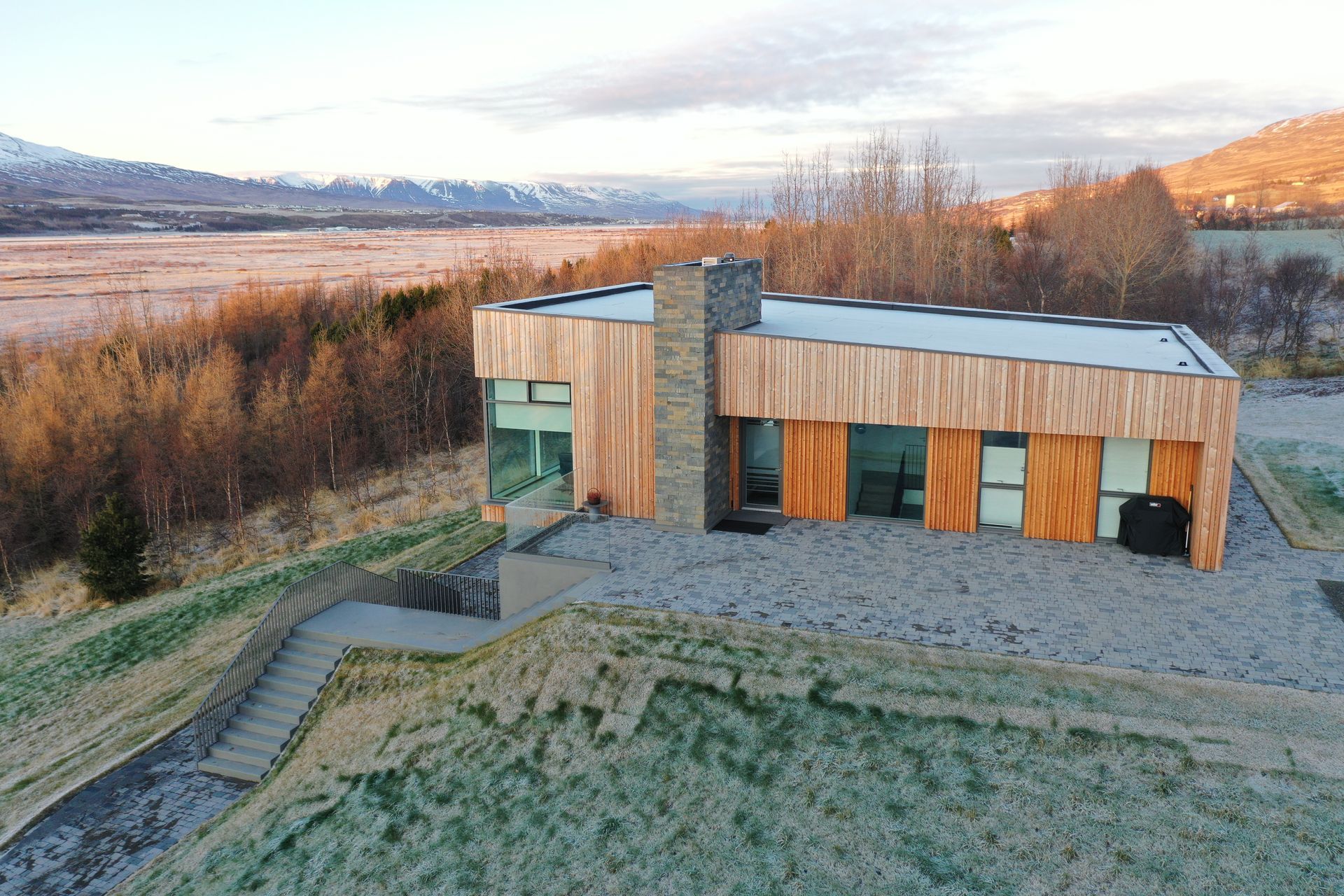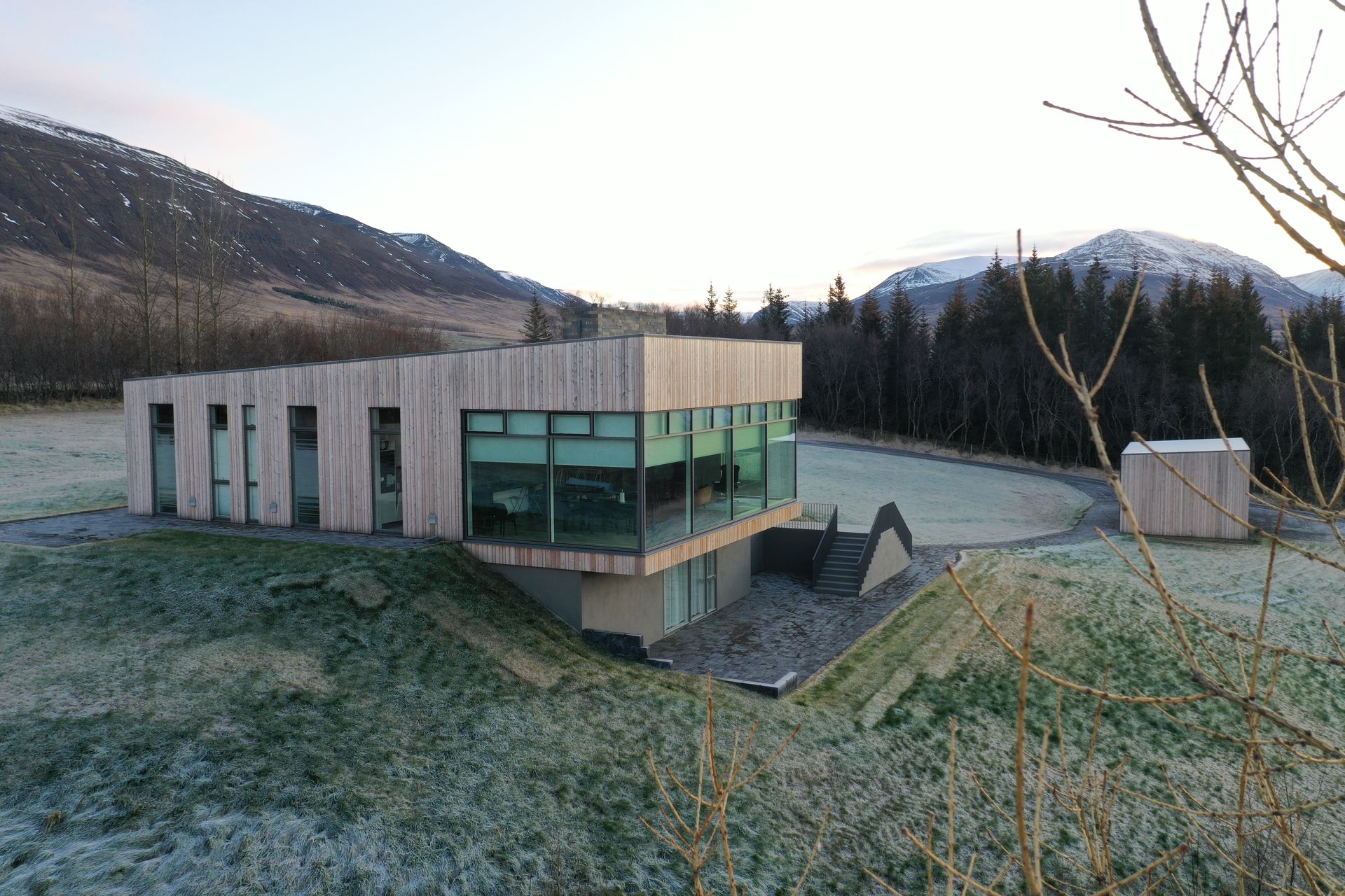 Stórar opnanir ramma inn útsýni bæði inn og út Eyjafjörðinn og skapa sterka tengingu milli innra rýmis og landslags. Þar myndast samspil arkitektúrs og náttúru sem mótar heildstæða upplifun.