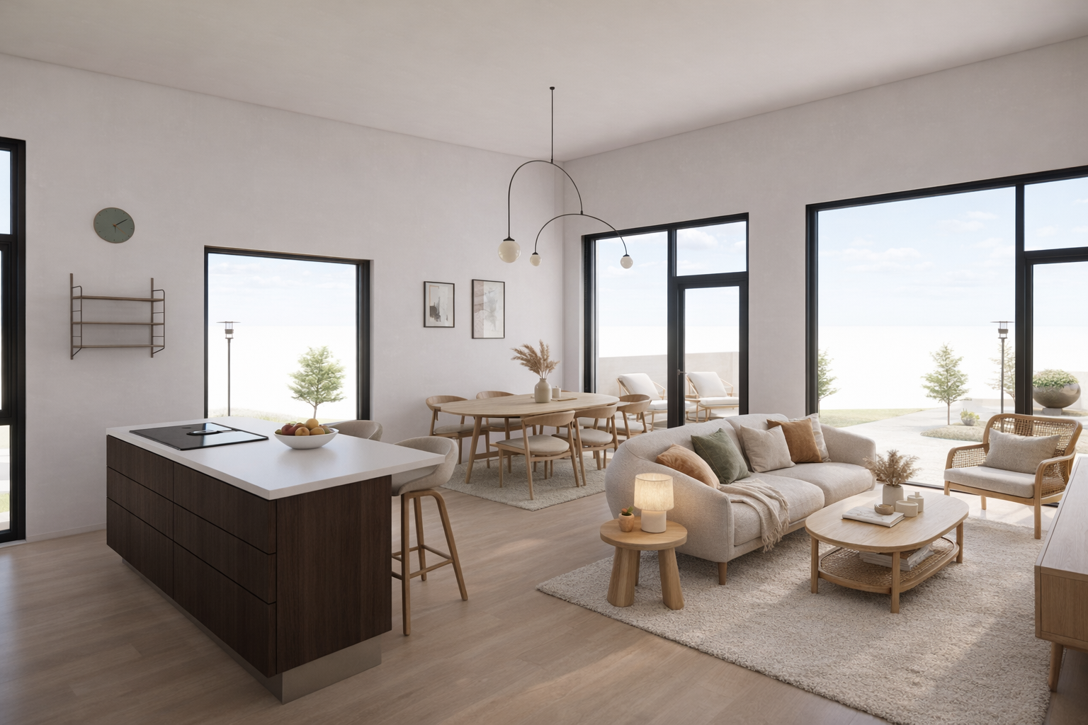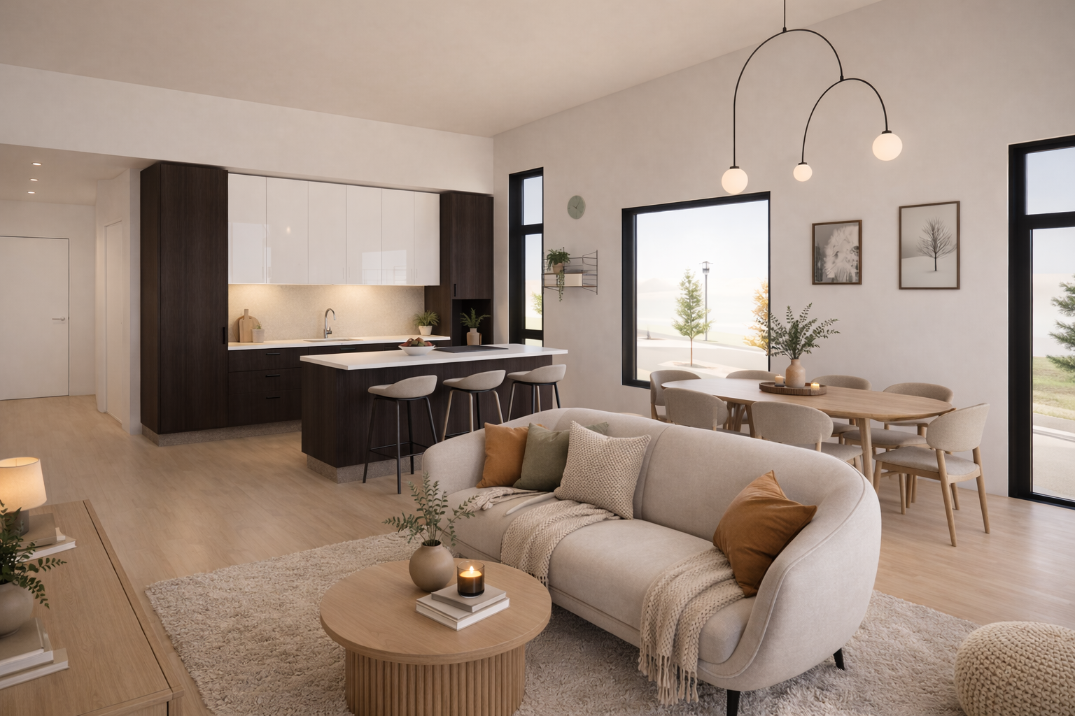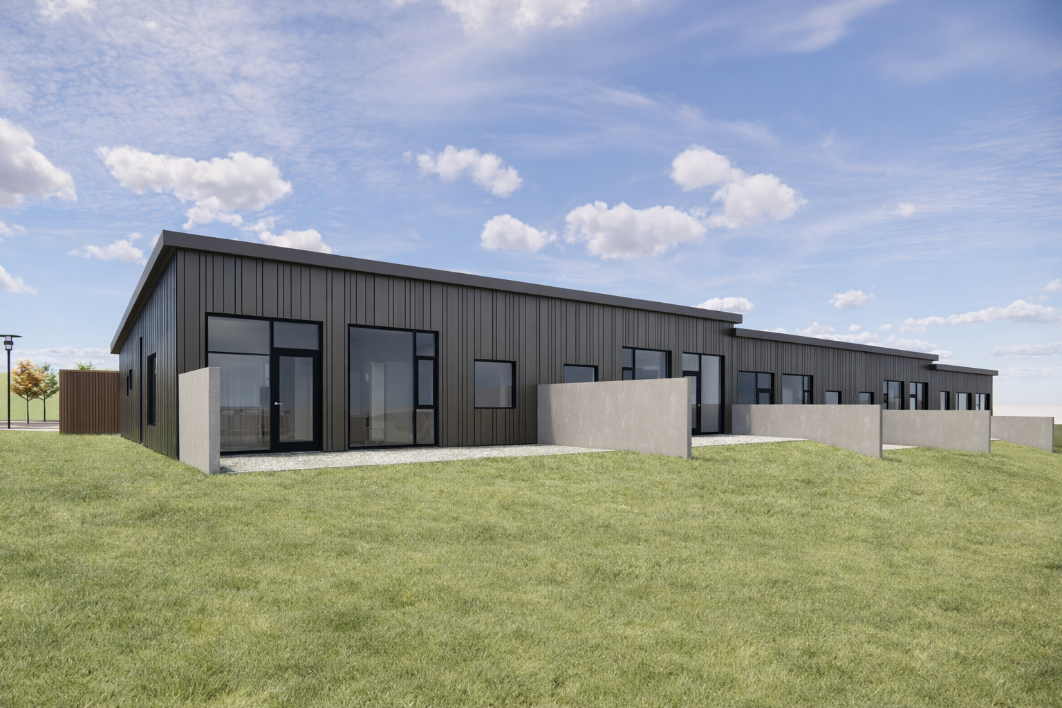 Verkefnið felur í sér fimm íbúða raðhús þar sem hver íbúð er hönnuð fyrir allt að fjögurra manna fjölskyldu. Skipulag byggir á skýru og hagkvæmu rými, með þremur svefnherbergjum og opnu alrými þar sem stofa og eldhús mynda sameiginlegt hjarta heimilisins. Stoðrými eru samþætt með áherslu á góða nýtingu og einfalt daglegt flæði.