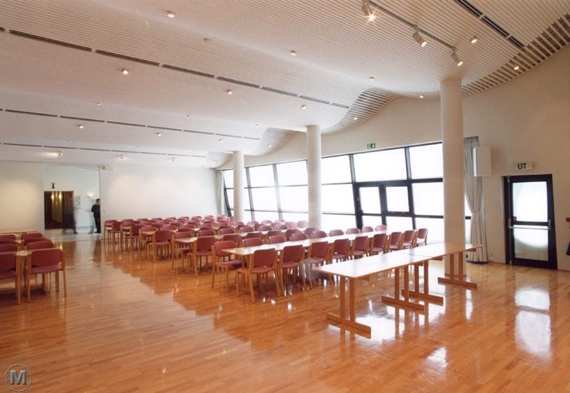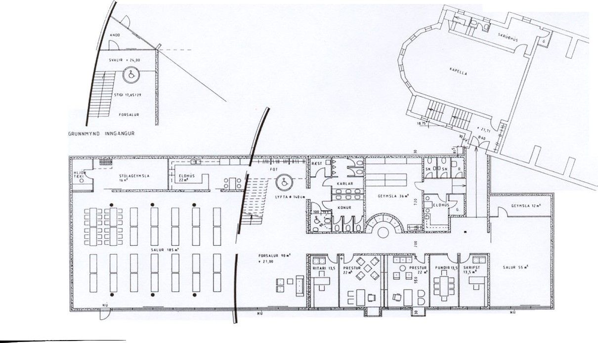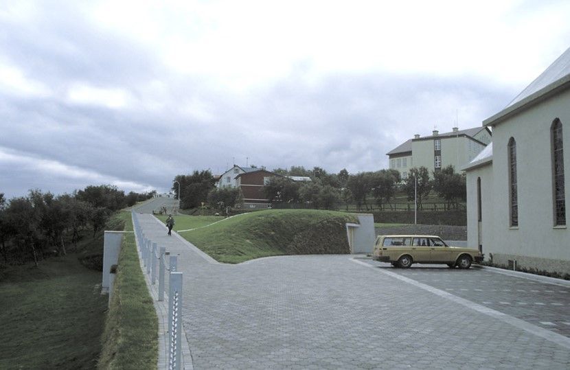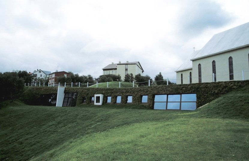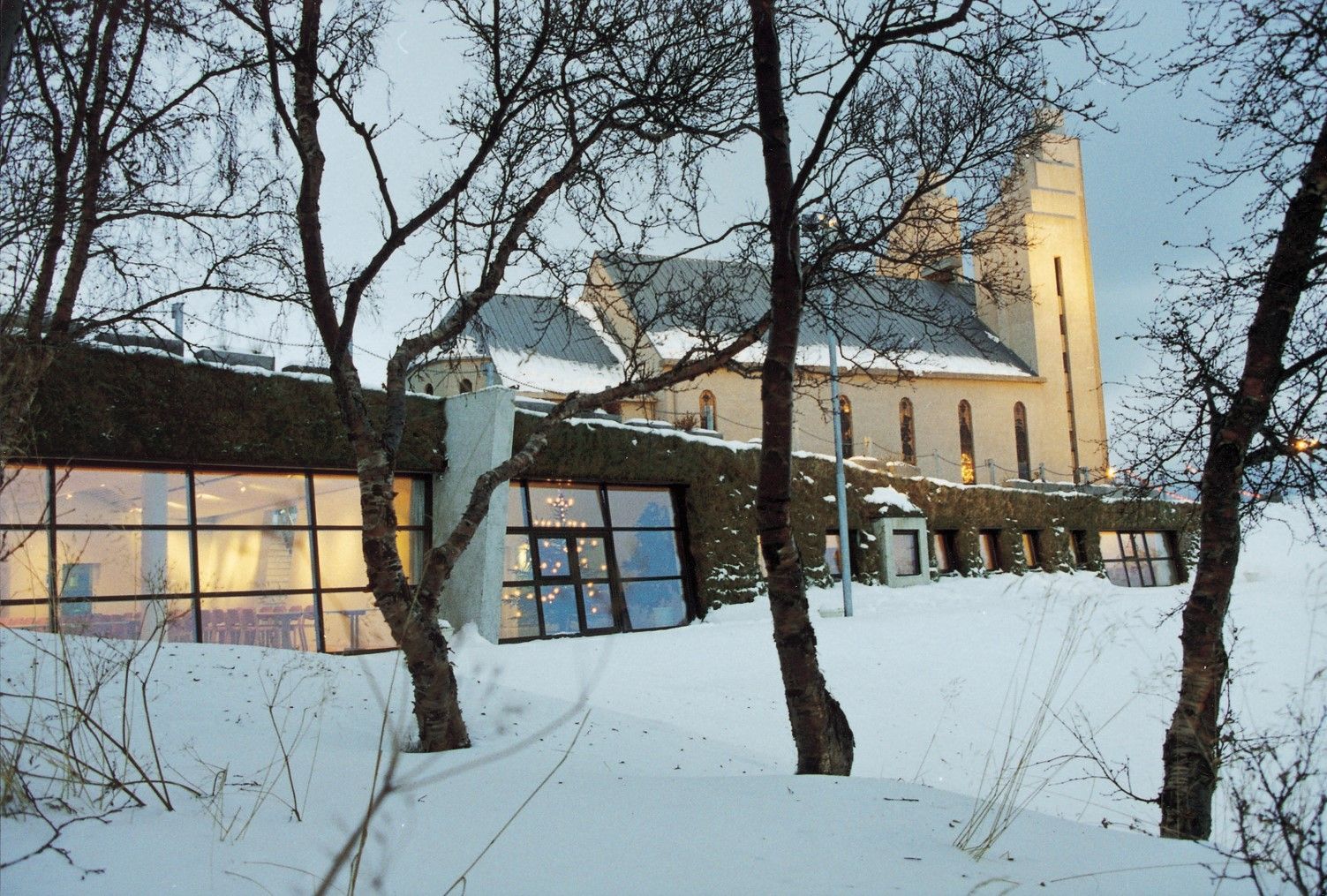 Safnaðarheimilið við Akureyrarkirkju stendur í hlíðinni sunnan við kirkjuna og tengist henni með lágreistri viðbyggingu. Byggingin er mótuð af einföldum og skýrum formum sem falla vel að kirkjunni og umhverfinu í brekkunni. Skipulag hússins leggur áherslu á björt samkomurými og sveigjanlega notkun fyrir safnaðarstarf, fundi og viðburði. Stórir gluggar opna rýmin að bænum og fjallasýninni og skapa sterka tengingu við landslagið í kring.