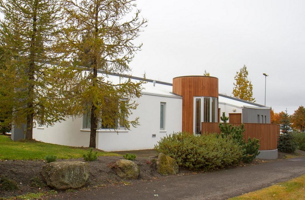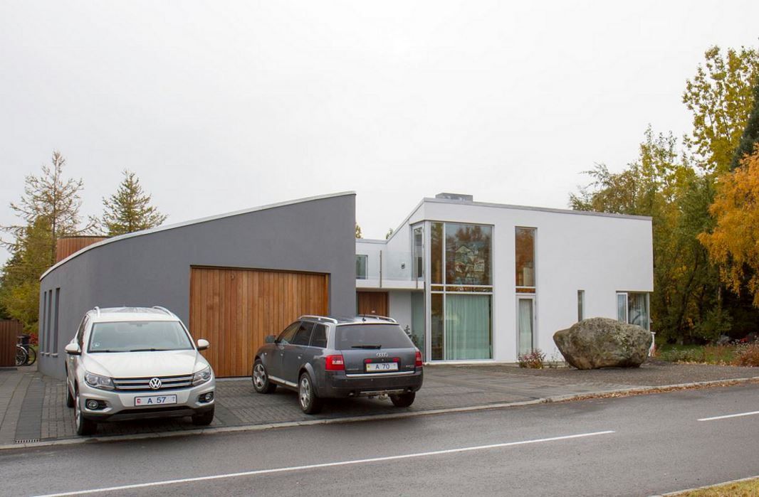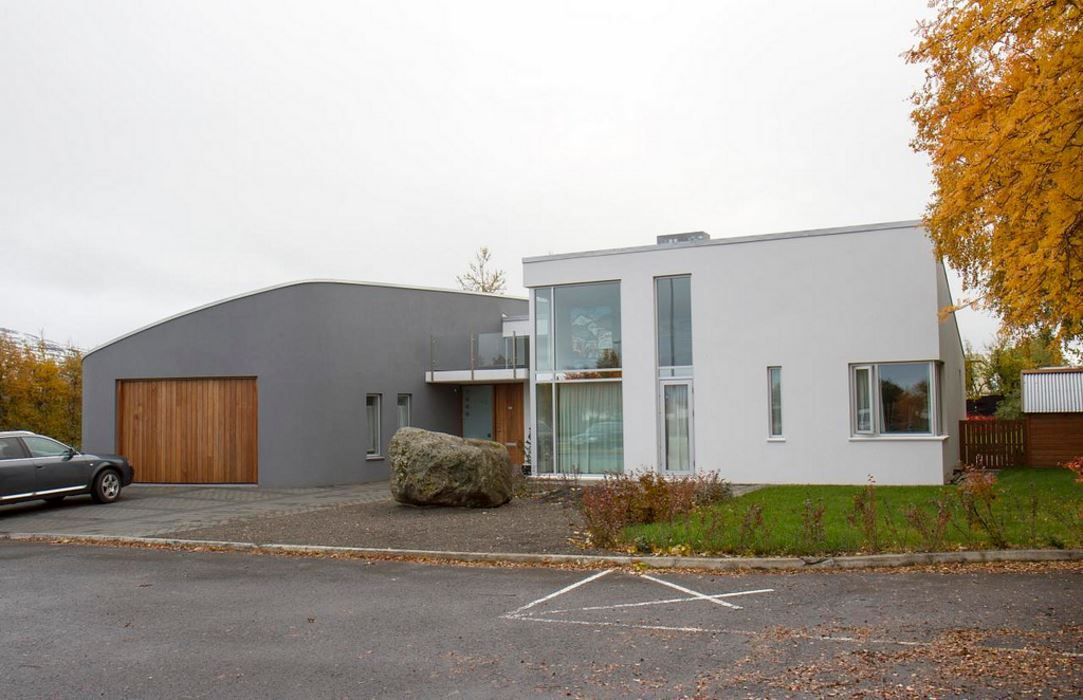 Einbýlishús á einni hæð með risi þar sem unnið er með skýrt meginform, rúmfræðileg uppbrot og efnislega útfærslu til að skapa heildstæða og skýra arkitektúrlausn.